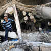 A Palestinian man walks through the ruins in the aftermath of Israeli air strikes, in Gaza City.