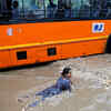 A girl plays on a flooded street after heavy rains in New Delhi, India.