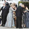Greece's King Constantine II (3rd R) and Queen Anne-Marie (5th R) are greeted by other guests as they arrive for a pre-wedding dinner ahead of the wedding of Britain's Prince William and his fiancee Kate Middleton at the Mandarin Oriental Hotel in London on April 28, 2011.