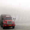 A truck is seen waiting outside a toll booth after it is shuttered as heavy smog spreads on a highway as vehicles are forced to wait due to heavy smog in Jilin, northeast China's Jilin province.