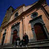 People have drinks while sitting on the steps of a church in Civita di Bagnoregio, accessible only by a bridge and known as 'the dying town' due its susceptibility to erosion and landslides, Italy.