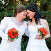Hungarian transgender couple, Elvira Angyal and Tamara Csillag, pose for a picture after their wedding in Polgardi, Hungary.