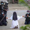 A nun pleads with police not to harm protesters in Myitkyina in Myanmar's Kachin state, amid a crackdown on demonstrations against the military coup.