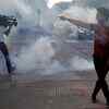 A reporter runs to take shelter as the police starts firing tear gas shells.