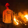 A firefighter looks at the wildfire with a feeling of helplessness, as the fire is the largest one in Southern California this year.