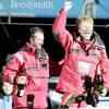 Jean Pierre Dick (R) and Damian Foxal (L) celebrate after arriving first in the Barcelona World Race at the port of Barcelona on February 11, 2008 - Photogallery