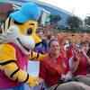 The mascot of the Commonwealth Youth Games 2008, Jigrr, meeting with foreign players at the Balewadi Sports Complex, the venue of the games in Pune on October 11, 2008. (PTI Photo)