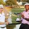 Camilo Villegas (L) of Colombia holds the trophy after winning the Tour Championship golf tournament and Fedex points champion Vijay Singh holds the Fedex trophy at East Lake Golf Club in Atlanta on September 28, 2008. (Reuters/Tami Chappell)