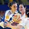 Denmark's Louise Mortensen (R) vies with France' s Siraba Dembele (L) during the 8th Women's Handball European Championships match in Boris Trajkovski sports hall, in Skopje on December 3, 2008. (AFP Photo/Robert Atanasovski)