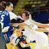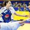Denmark's Kamilla Krisrensen (down) vies with France's Camille Ayglon (up) during their women's Handball European Championships match at the Boris Trajkovski sports hall in Skopje on December 3, 2008. (AFP Photo/Robert Atanasovski)