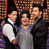 Bollywood superstars Shah Rukh Khan, Priyanka Chopra and Hrithik Roshan on the sets of television reality show 'Just Dance' at Filmcity, Mumbai, on September 29, 2011. (PTI)
